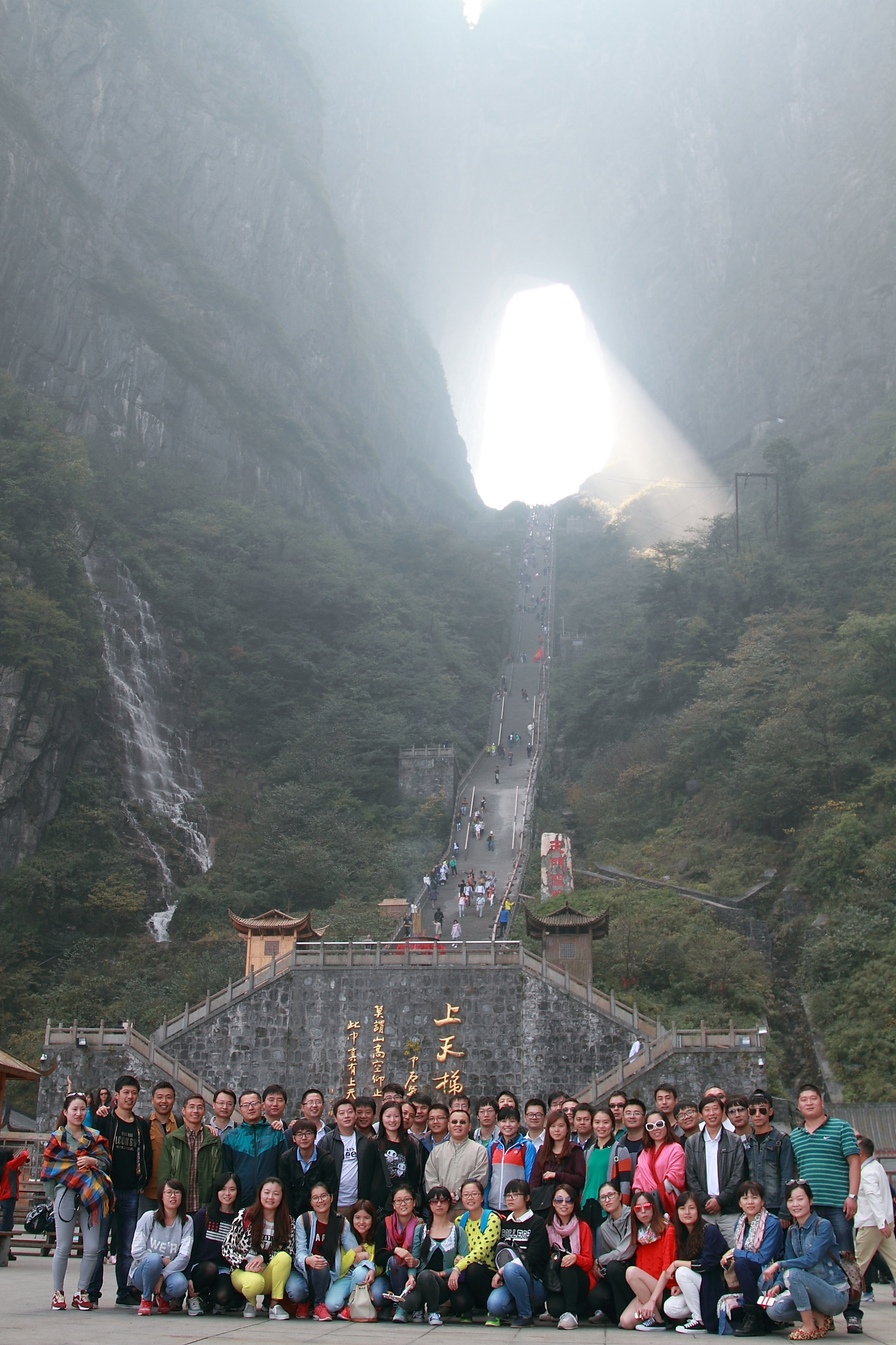 ——天门山,海拔1518.6米,山体四周绝壁,拔地临空,气势冲天。于高绝奇险中更见秀丽宜人,是张家界的文化圣地,被尊为“张家界之魂”。在这里,我们乘景区BUS感受了“天下第一公路奇观”通天大道的惊奇体验;抵达天门洞底,感受造化神奇,尽情欣赏天门洞内外的壮丽景色;走玻璃栈道胆颤心惊;乘坐世界最长的索道,体验凌空飞仙般的神奇感觉,赏空中花园的山水画长卷,体验“云生脚下、奇峰尽览、万象目中”的豪迈感觉。合影走起喽。